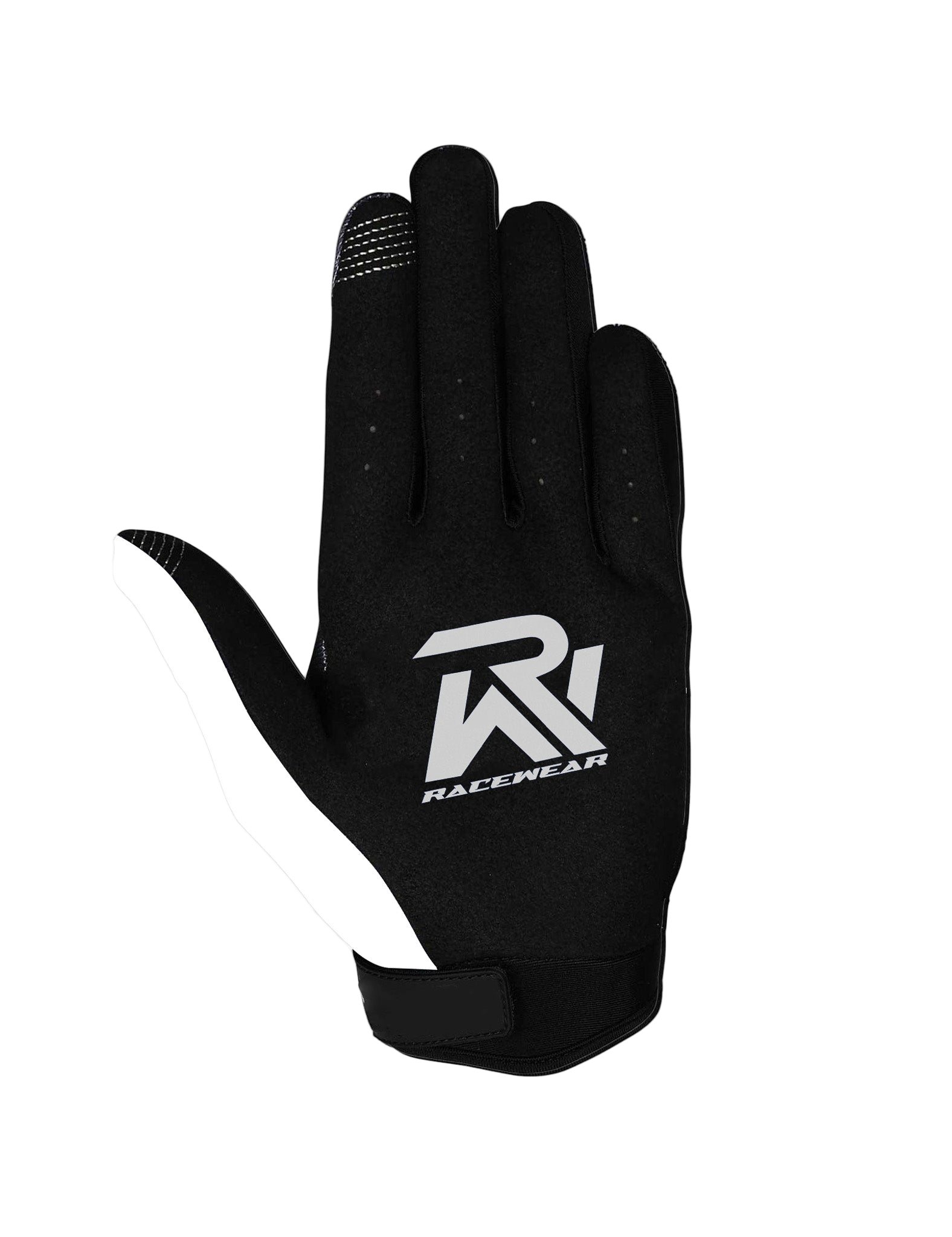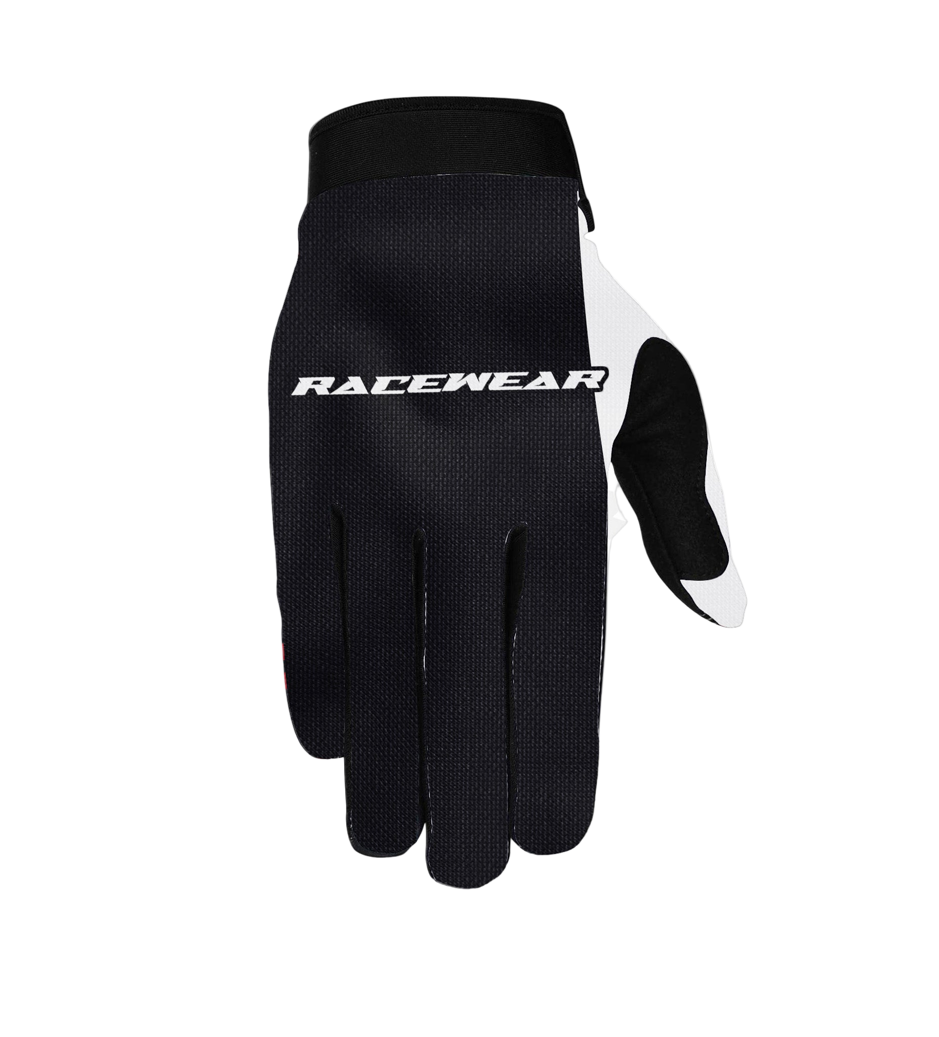 Sleek, simple, and built for performance. These Racewear gloves feature an all black and white design for a clean, versatile look that pairs with any kit. Made from lightweight, breathable materials, they deliver a comfortable, stretch fit that feels natural on the bars. With the printed silicone logo on the palm you will have the perfect grip through every sprint, jump, and corner, while reinforced stitching ensures lasting durability. Minimal in style, maximum in performance